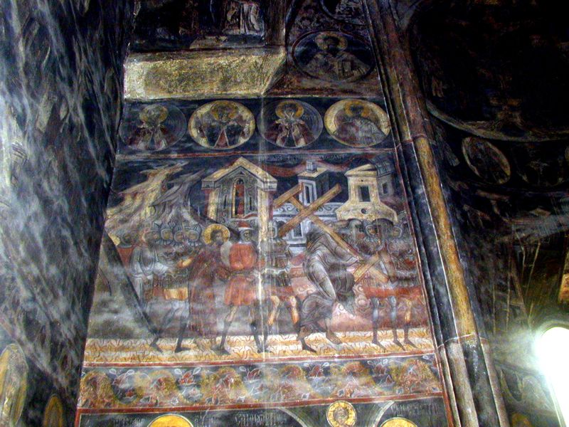 Pictura interioară datează din domnia lui Petru Rareş (1527-1531) după cum arată şi pisania slavonă zugrăvite deasupra tabloului votiv din naos. În 1930 a avut loc o spălare a vechii picturi de retuşurile ulterioare.