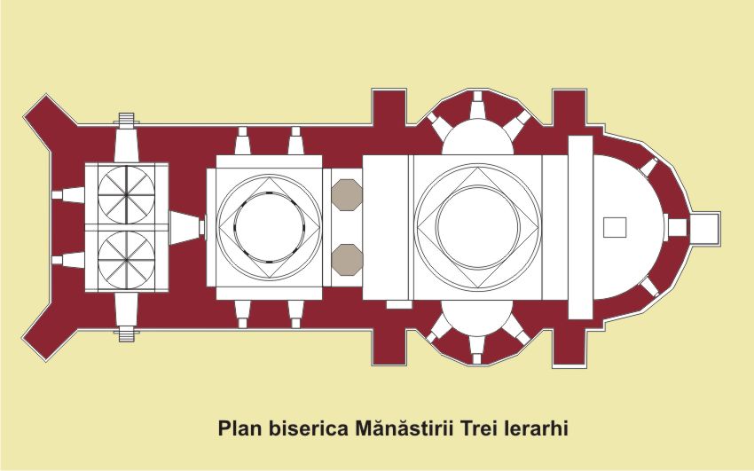 La realizarea bisericii, ctitorie a domnitorului Vasile Lupu (1634-1653) s-a lucrat din 1637 (sau chiar mai devreme) până în 1642, când s-a încheiat pictura în interior, pentru care au fost aduşi zugravi din Rusia. Pisania spunea că a fost sfinţită la 6 mai 1639 (Dan Bădărău, Ioan Caproşu:2007, p.172). Se afla pe Uliţa Mare, în apropiere de Curtea Domnească (Viorel Erhan:2003, p.69). Biserica a fost construită din blocuri de calcar cioplit şi fasonat, lipite între ele cu plumb topit. (Viorel Erhan:2003, p.70). Planul Trei Ierarhilor nu se deosebea, în linii generale, de planul tipic al bisericilor moldoveneşti contemporane, el fiind o prelucrare a celui de la Galata, căruia i se înlătură gropniţa şi i se îngustează pridvorul pînă la lăţimea pronaosului. Ca şi aici, zidul dinspre pronaos este suprimat şi înlocuit cu trei arcade rezemate pe doi stâlpi (Dan Bădărău, Ioan Caproşu: 2007, p.183). Alte asemănări, ale elementelor decorative interioare şi exterioare, trimit la mănăstirea Dragomirna (Dan Bădărău, Ioan Caproşu: 2007, p.187). Planul bisericii este cel moldovenesc din prima jumătate a veacului al XVII-lea, având formă dreptunghiulară, cu cele trei abside poligonale în exterior şi semicirculare în interior, cu câte trei ferestre fiecare. Existau două intrări prin pridvor, la nord şi la sud, dar cea din peretele nordic este în prezent blocată. Interiorul era împărţit în pridvor, pronaos, naos şi altar, toate de aceaşi lăţime, dar de lungime diferită (Viorel Erhan:2003, p.71). Avea două turle, una desupra pronaosului, celalată deasupra naosului. Unicitatea monumentului vine însă din „reţeaua continuă de ornamentaţie” în piatră sculptată, ce acoperă pereţii exteriori. Modelele decorative au un ecou destul de vizibil în lumea orientală, fiind „mai cu seamă armeneşti, georgiene, persane, arabe şi turceşti”. Se pot identifica însă şi elemente de inspiraţie rusă, baroc occidentală sau autohtonă (Viorel Erhan: 2003, p.70). Cu totul, dacă socotim şi etajele de ornamente de pe turle, avem „treizeci de benzi de decoraţie” (Dan Bădărău, Ioan Caproşu: 2007, p.188). Paul de Alep, sirianul care a trecut prin Moldova la 1653, scria că biserica „uimeşte mintea celui care o vede”, iar turcul Evlia Celebi, în 1659, că „nu-i chip s-o descrii cu limba sau cu pana” (Viorel Erhan:2003, p.70). Pictura originală a bisericii, lucrată în anii 1641-1642, a fost executată de „în aur şi azur” de meşterii ruşi Sidor Pospeev, Iakov Gavrilov (decedat la Iaşi, în timpul lucrărilor), Deico Iakovliev şi Pronka Nikitin, cei mai buni pictori de la curtea ţarului. Ei au fost ajutaţi de moldovenii Nicolae Zugravul şi Ştefan Zugravul (Viorel Erhan:2003, p.75)